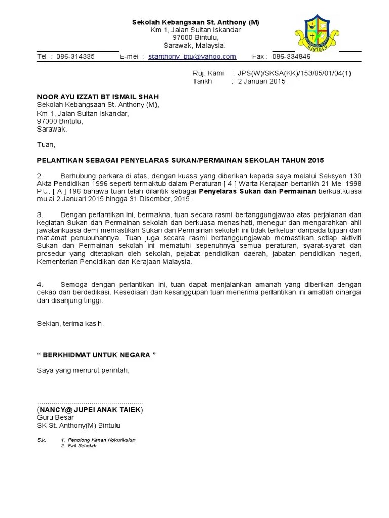 Surat lantikan ini amat penting buat semua guru untuk disimpan sebagai rekod untuk penilaian melalui penilaian bersepadu pegawai perkhidmatan . Manankia · contoh surat pelantikan jawatankuasa kewangan sekolah · contoh surat penurunan kuasa pengetua · contoh surat lantikan ajk program cute766 · surat . Muat turun contoh surat surat pelantikan jawatankuasa di sekolah cikgu share. Penentuan spesifikasi perlu disediakan mengikut format yang ditetapkan oleh pejabat bursar. Eksa pkd perak tengah surat lantikan .