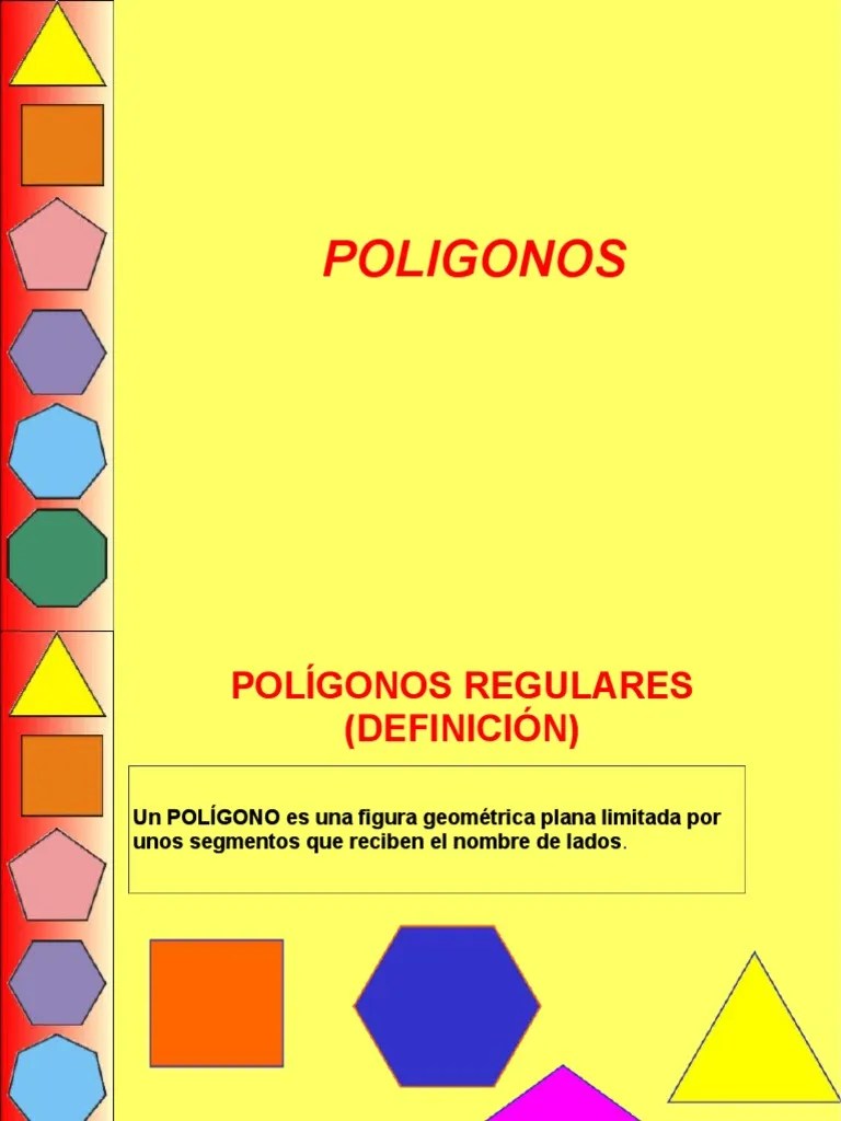 Un polígono es una figura plana con lados rectos. 6 lados, hexágono regular ; Nombre de los polígonos según su número de lados. Tiene 4 lados y ángulos iguales. Para que una figura formada por líneas se .