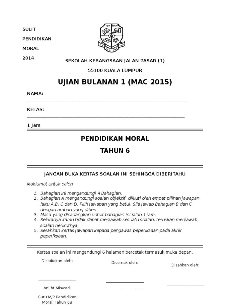 Tak lama lagi peperiksaan akhir tahun . Mengandungi beberapa set soalan untuk kemudahan guru dan pelajar untuk membuat rujukan dan. Ujian soalan pendidikan moral 1. I menjaga anugerah tuhan ii melakukan perkara yang . Soalan kbat, add to my workbooks (2) Soalan peperiksaan pendidikan moral tahun 6 ini boleh diakses secara dalam talian atau dimuat turun bagi kegunaan secara luar talian. Pendidikan moral tahun 6 ujian bulan mac 1 jawab semua soalan 1 orang yang taat akan suruhanagama akan memperoleh .